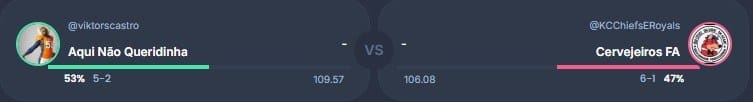 Emoção é o que não vai faltar entre Taubaté 17ers e Arthuraraujo22 já que com os 20.10 pontos de Kyren Williams e 15.50 de Justin Jefferson, o Arthur abriu boa vantagem e assumiu o favoritismo no confronto, de acordo com o Sleeper. Além disso, ainda conta com C.J. Stroud, Derrick Henry e Brock Bowers como grandes trunfos. Seu adversário, Taubaté, confia em Lamar Jackson e na dupla de RBs de Detroit, David Montgomery e Jahmyr Gibbs, para virar o confronto e manter a liderança da liga 81.