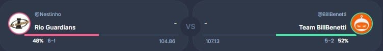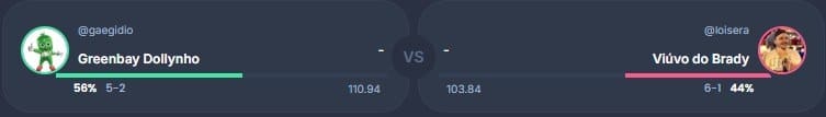 Na liga 61, temos um confronto que não foi impactado pelo jogo entre Vikings e Rams, deixando toda a emoção para domingo e segunda-feira. O Mad Son’s confia em C.J Stroud, Jahmyr Gibbs, Drake London e Jayden Reed para assumir a liderança da liga. Já o Giuseppe, que é o maior pontuador da liga, com média de 120 pontos por jogo, vem com força máxima e conta com Josh Allen, Derrick Henry e Ja’Marr Chase para abrir dois jogos do 2° colocado. Quem será que vence?