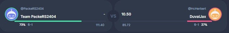 Com somente 13 desafiantes invictos na Superliga inteira (de 1056 participantes!), o grande duelo da semana é entre desafiantes 6-1. A batalha será travada entre o PackeRS2404 e o DuvalJax, que iniciou com 10.50 pontos de frente graças a Aaron Jones. Josh Jacobs, Tyreek Hill, Saquon Barkley e DaVante Adams são alguns dos nomes que irão participar desse confronto. Quem será que vence essa batalha que vale a liderança da liga 69?